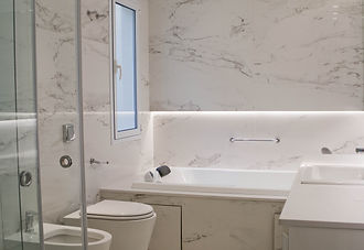 Para dar mayor amplitud al acceso, se tomó superficie de la cocina, y se convirtió el baño de servicio en toilette de recepción. Se bajaron con placas de roca de yeso sectores del cielo raso para enmarcar dos áreas intermedias. Se abrieron los extremos de la pared que divide el estar del dormitorio a fin de posibilitar una mejor integración, y dar sensación de amplitud. Dos planos corredizos de grandes dimensiones permiten independizar ambos ambientes.